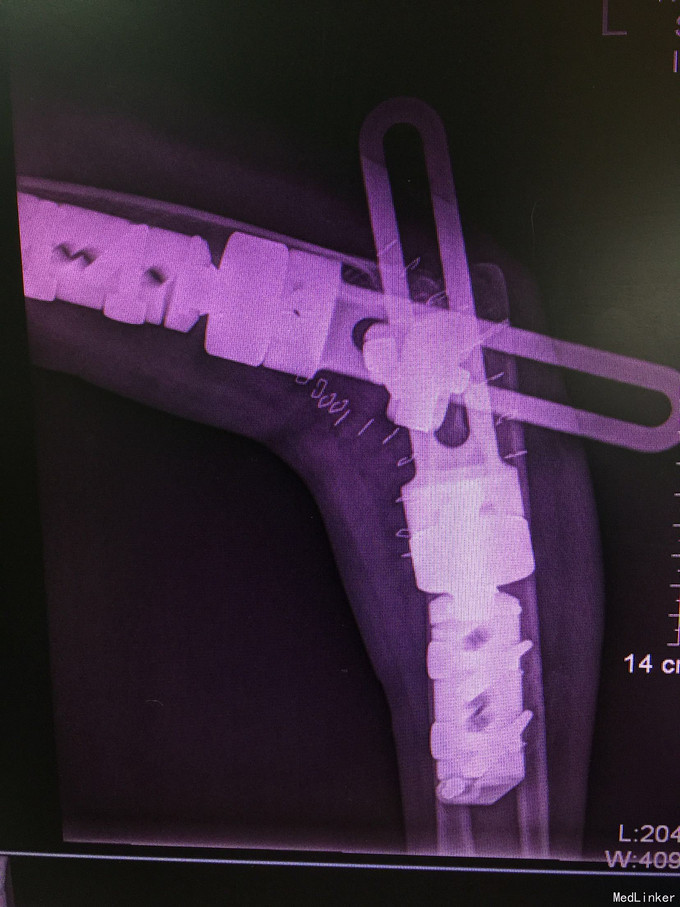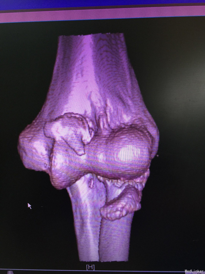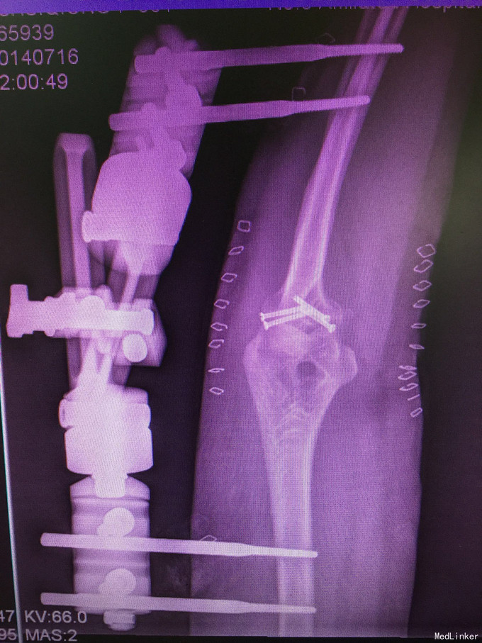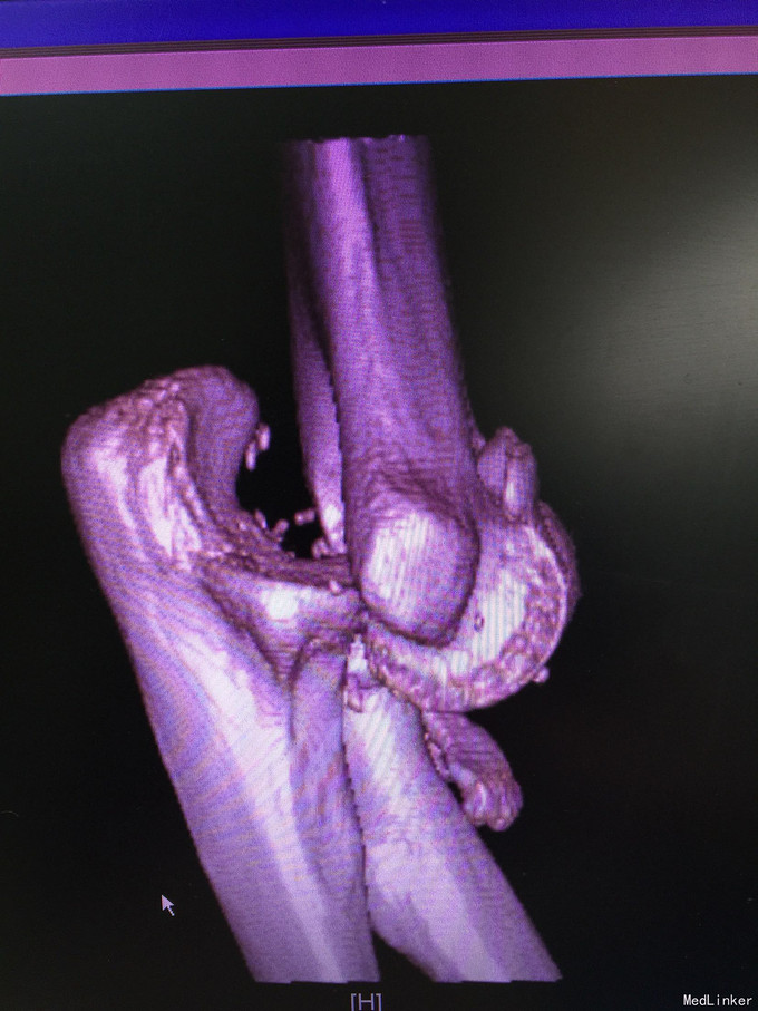 诊断为左侧肘部恐怖三联征。 行左侧肘部恐怖三联征切开复位内固定术,术后停留外固定器。