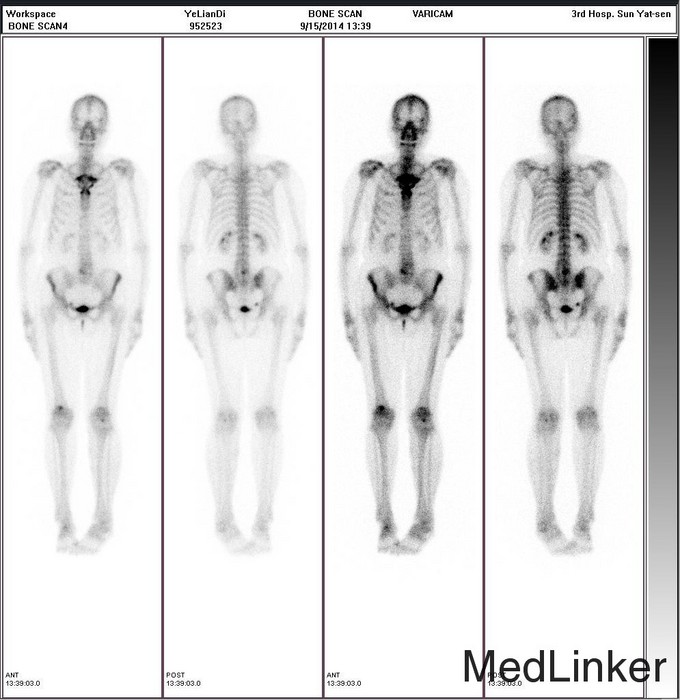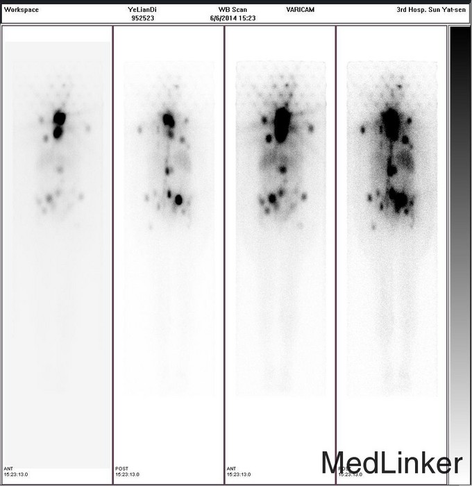 诊断:甲状腺恶性肿瘤(术后);手术后甲状腺功能减退。 治疗:入院时甲状腺球蛋白>455pmol/L,甲状腺素2.793uIU/ml,根据病情于2014-6-3予大剂量碘-131 100mCi清甲治疗;2014年6月全身碘扫示:全身多发异常摄碘组织,考虑甲状腺癌术后双侧甲状腺组织及锥状叶残留并全身多发骨转移。2014年9月胸部CT示:1、双肺多发转移瘤,并胸骨转移;胸1、8、10、腰1椎体内多发结节灶,考虑转移瘤可能性大。2、右肺中叶内侧段、双肺下叶散在慢性炎症。2014年12月全身碘扫:1.全身多处异常摄碘组织,考虑多发骨转移瘤。又于2014年12月复查甲状腺球蛋白抗体90.400U/mL,促甲状腺素6.914uIU/ml。遂于2014-12-22口服250mCi大剂量放射性碘-131。治疗后全身碘扫复查结果提示:2.左肺下叶摄碘组织,不排除转移瘤,建议进一步检查。与2014.6.6检查相比,颈部甲状腺部位放射性浓集灶消失,余病灶放射性浓集程度较前稍降低。