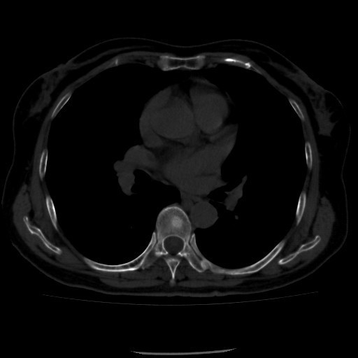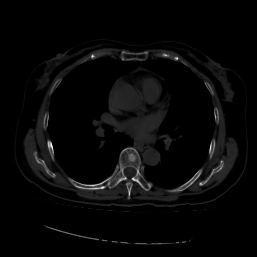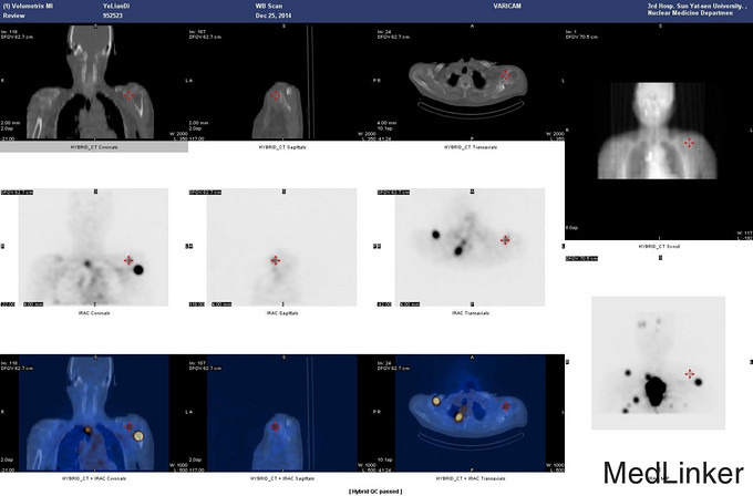患者又于2015年10月胸部CT复查,结果提示:1、甲癌术后改变;双肺多发转移瘤,大部分病灶较前缩小,左肺下叶病灶较前增多,部分较前增大;胸骨转移;胸1、8、10、腰1椎体内多发结节灶,基本同前,考虑转移瘤可能性大。2、右肺中叶内侧段、左肺上叶舌段及双肺下叶散在慢性炎症。