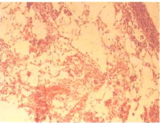 诊断: 右睾丸肿瘤。治疗: 在全麻下行右睾丸切除术及腹主动脉旁淋巴结清扫术。病理学检查: (1 ) 巨检睾丸大小 7cm 伊 6cm 伊 3cm, 切面灰白色鱼肉样, 散在紫褐色出血区及黏液变区。 (2 ) 镜检发现睾丸组织结构破坏, 瘤组织成分复杂, 图像多样, 以卵黄囊瘤和精原细胞瘤成分为多, 同时混有胚胎癌、 成熟或不成熟的畸胎瘤成分。 肿瘤大部分区域为疏松蜘蛛网状、 微囊结构,并含黏液样基质 (图 1 ) , 肿瘤细胞较小、 一致, 核深染, 胞浆透明, 可见肾小球样的 S-D 小体 (图 2) , 提示为卵黄囊瘤区域; 部分区域细胞丰富, 瘤细胞圆形或椭圆形, 核染色质丝状、 颗粒状, 核仁小, 胞浆透明空泡状或嗜酸粉染, 少量细胞核异型明显, 核分裂象易见, 提示为精原细胞瘤区域; 部分区域核大、 卵圆形、 空泡状, 核仁明显强嗜酸性, 胞膜界限不清,构成腺管样或实性团块状结构, 提示为胚胎癌区域; 并可见少量散在的异型明显的合体滋养叶细胞, 不成熟的神经管结构以及成熟的鳞状上皮、 黏液柱状上皮和平滑肌成分, 提示为畸胎瘤区域。 (3 ) 免疫组化染色示: AFP 弥漫强阳性, 胎盘碱性磷酸酶 (pl acent alal kal i nephos phat ase, PLAP) 、 白细胞分化抗原 (CD) 117、 CD30、 细胞角蛋白 (cel lker at i n, CK) 均为灶性阳性。 病理诊断: (右睾丸) 恶性混合性生殖细胞肿瘤。 术后AFP45. 65滋g/ L, HCG约1I U/ L, 降至正常。 随访 9个月, 未见复发和转移。