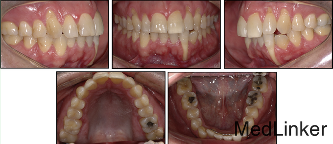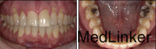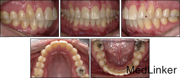 36岁,男性,主诉下颌左侧侧切牙唇侧牙龈退缩明显,伴有疼、刺激痛症状。 骨性牙性II类已经在几年前于外院矫治完成,,上颌佩戴可摘保持器,下颌3-3舌侧丝粘接保持