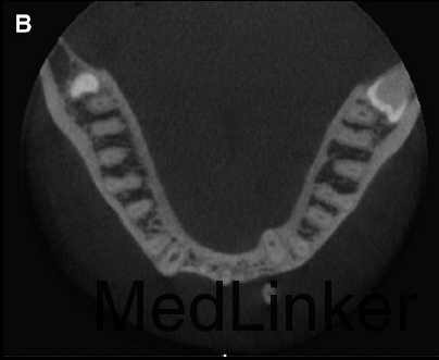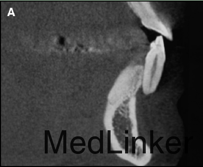 舌侧丝保持器在右侧侧切牙与尖牙间被破坏,右侧中切牙与侧切牙舌向移动,而左侧尖牙唇向移动。下颌运动过程中,左下2承受了切导的全部负荷。左下2活力测试显示无活力。CT矢状向显示32牙完全位于骨皮质外,32牙根尖1/3横断面显示牙根周围无骨质包绕