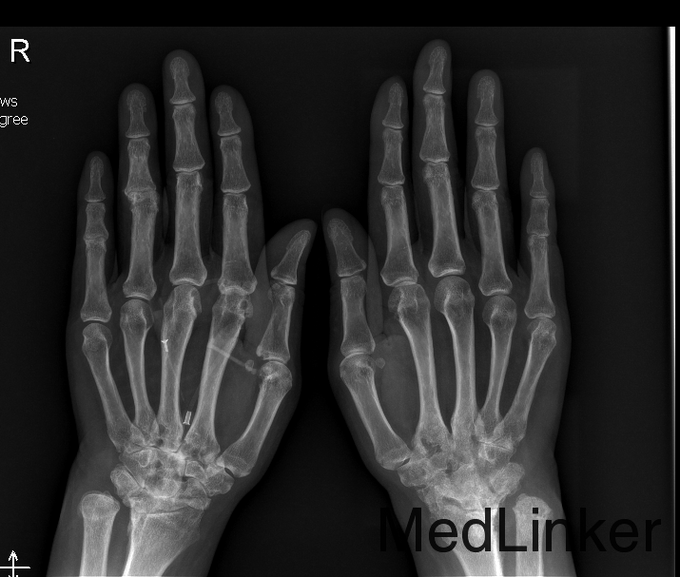 患者,女,51岁,因“反复多关节肿痛伴关节畸形5年余,加重1月”收入院。既往乙型病毒性肝炎;