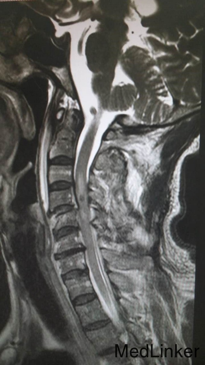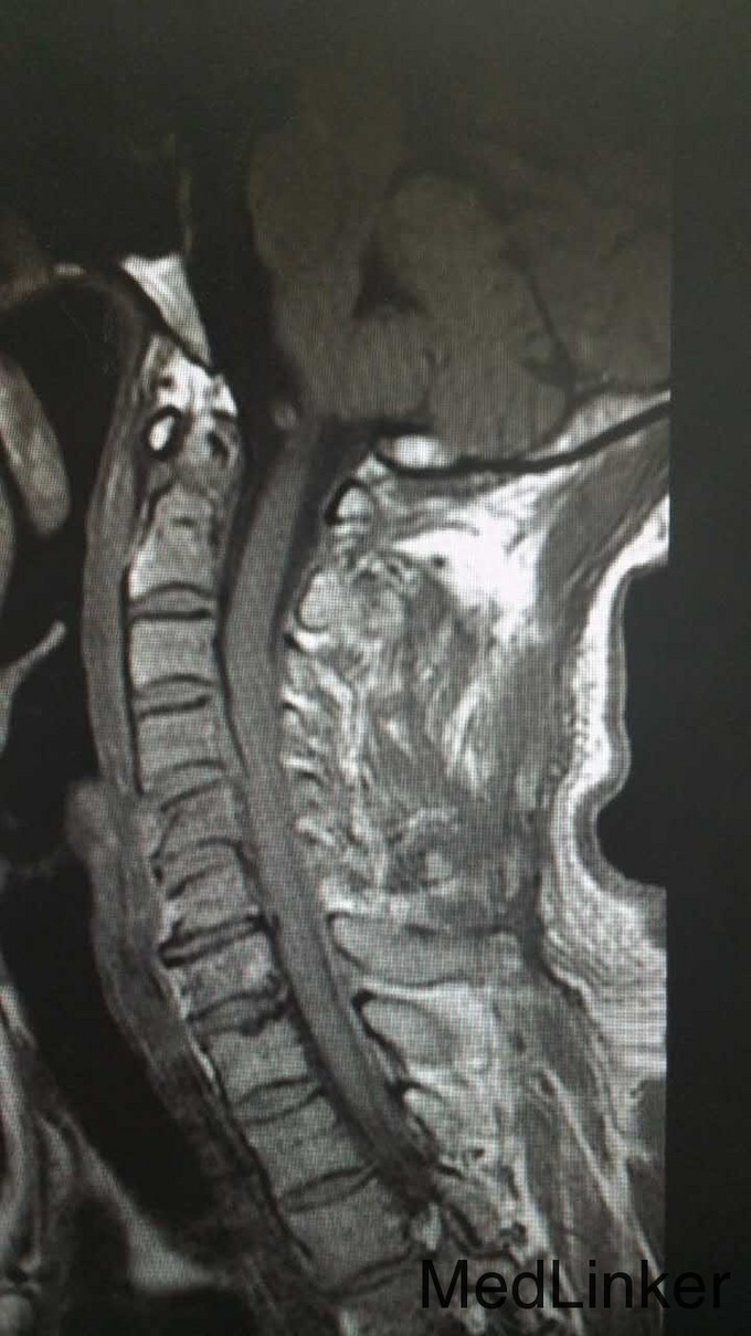 随访:现术后10天,患者右上肢肌力4级,右下肢肌力1-2级,左上肢肌力1级,左下肢肌力0级。 讨论:患者颈椎脊髓损伤,脊髓出血伴水肿,局部压力高,行减压后缓解局部压力,有助于脊髓功能恢复。