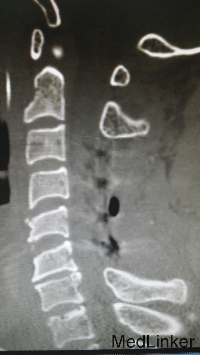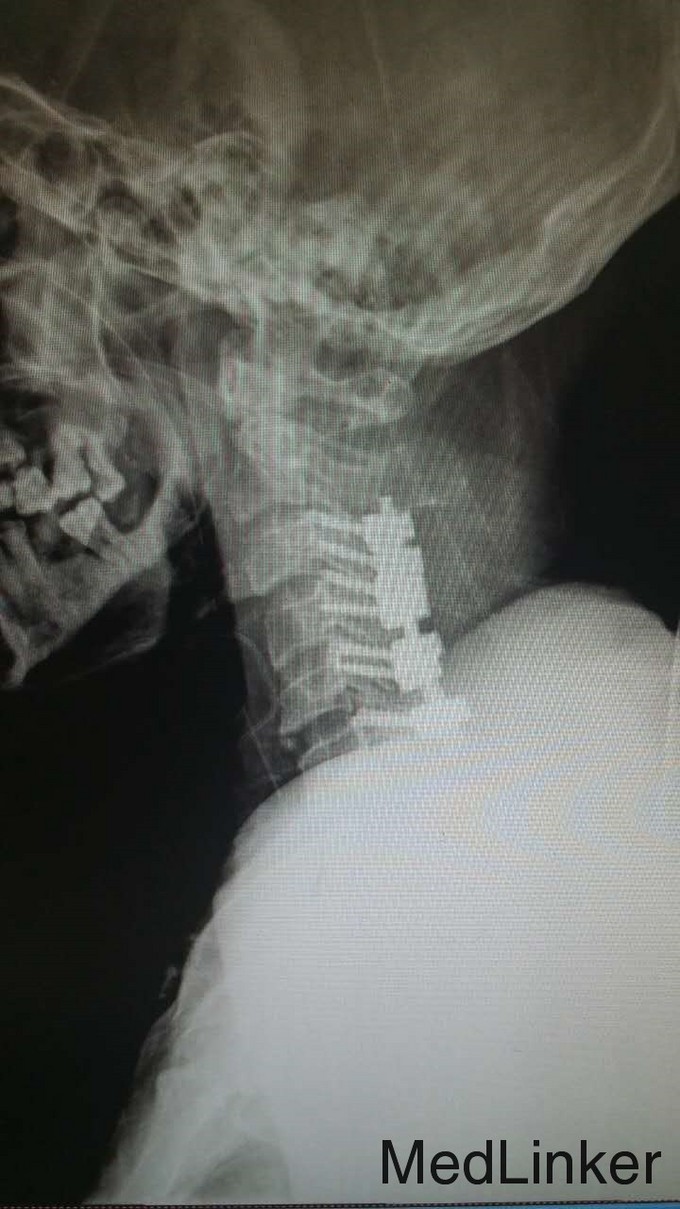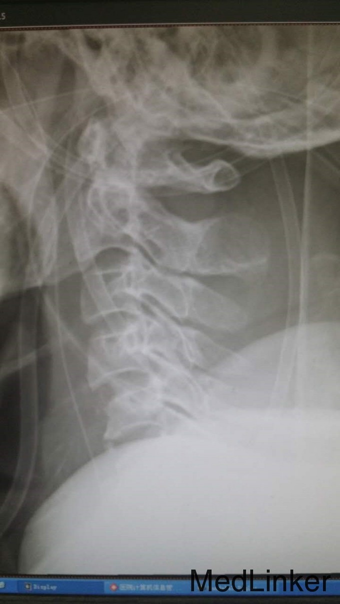 诊断:1.C3-6水平颈髓损伤出血伴水肿,2.C4左侧椎扳、侧块、C5-6左侧横突多发骨折,3.C5椎体压缩骨折,4.C4椎体滑脱(Ⅰ度) 治疗:伤后5天,予行C3-6椎板切除、椎管减压,侧块固定融合术