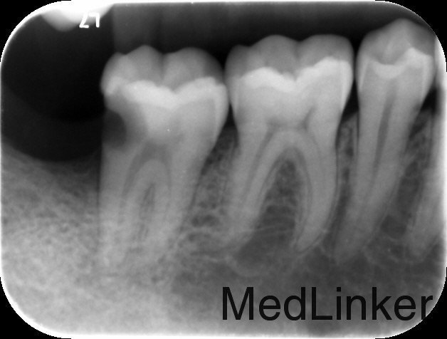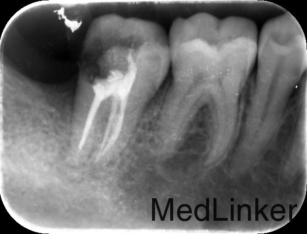 检查:47远中深龋坏,近髓,叩诊无不适,冷热测敏感,松动0度,X线片显示47远中深龋坏近髓,牙周膜影略增宽。