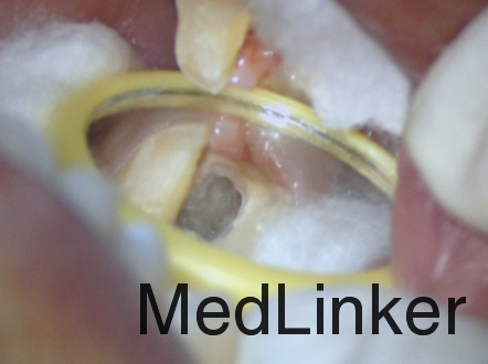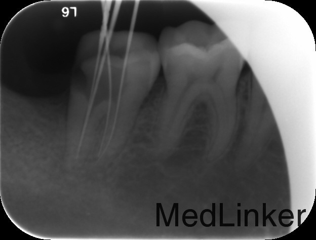 诊断:47牙髓炎 治疗计划:47根管治疗后冠修复。 处置:47碧蓝麻醉下,去腐,降牙合,开髓,揭髓,EDTA伴随下根管预备,冲洗,超声荡洗,干燥,激光消毒,封氢氧化钙。二次复诊:冲洗,试尖,AHplus糊剂和热牙胶充填。