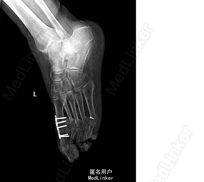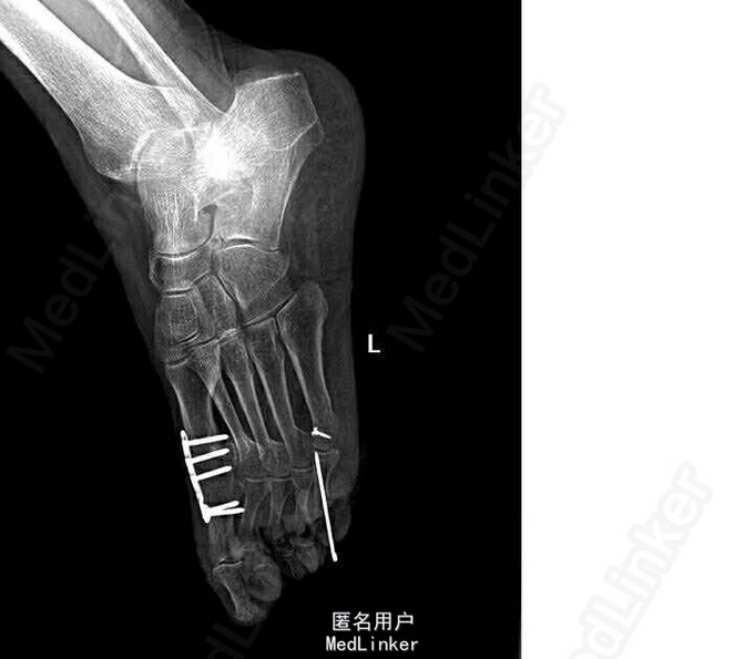 诊断:双侧扁平足(左侧重),左足截骨矫形术后,左足第一、五跖趾骨关节炎 局麻下行“左足矫形术(第五趾间关节融合内固定,第一、三、五趾骨屈肌腱松解,第一趾骨伸肌腱紧缩术)”。