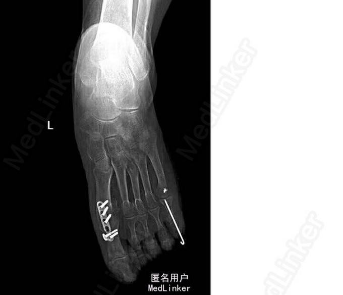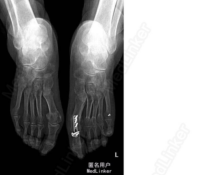 64岁,女性。3年前发现因双侧扁平足,双踇趾外翻,左侧较重,于我院行左足截骨矫形内固定术。1年前感左足踇趾疼痛,诊断为周围神经炎,予以弥可保治疗后感症状缓解。1月后仍感左足踇趾疼痛,行走时加重。