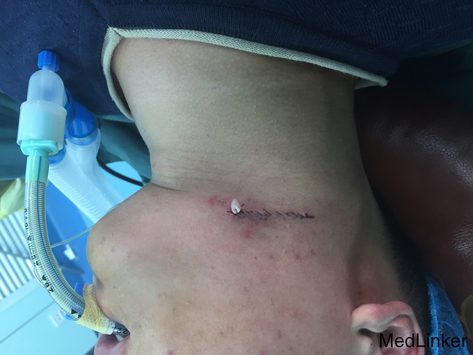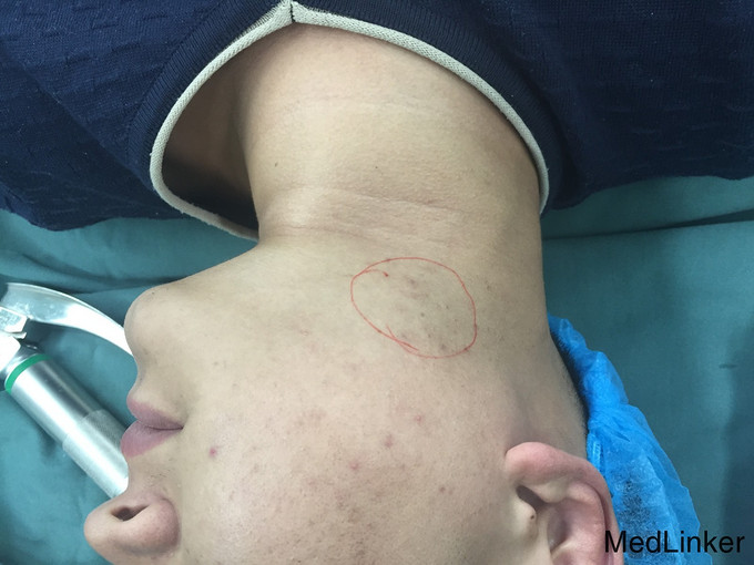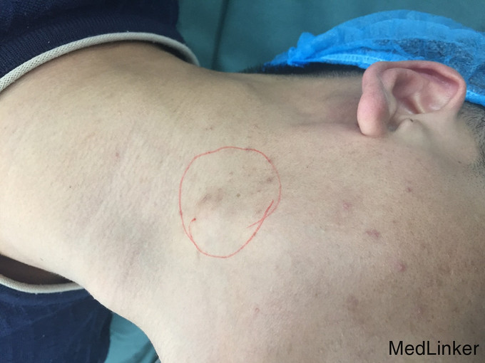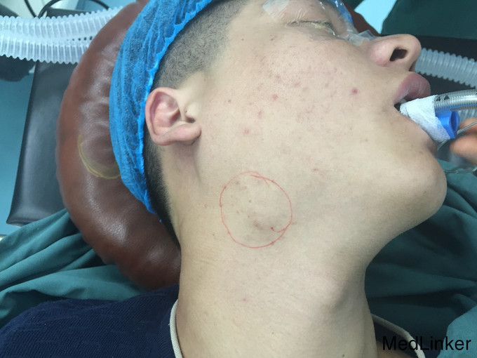主诉:右颌下区肿物半年余。 病史:无明显诱因出现右颌下区肿物,无明显自觉症状,半年来逐渐增大要求手术治疗。