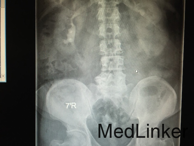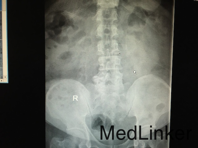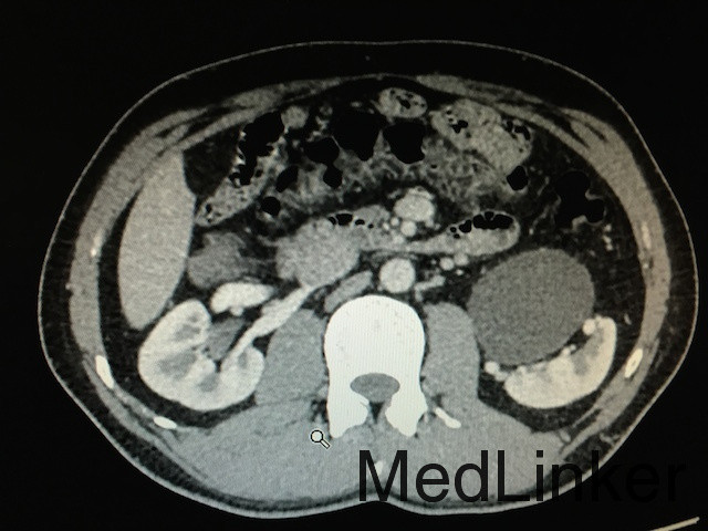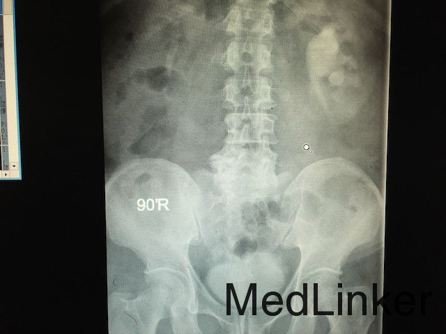 查体:无明显异常。 辅助检查:肾功能提示血肌酐371μmol/L,血象明显升高,尿常规白细胞升高。泌尿系CT:左侧输尿管上段结石,大小约为1.5cm,左侧肾盂肾盏积水扩张; IVP:左肾实质对比剂排泄缓慢,左侧肾盂和肾盏扩张积水。(如下图所示)