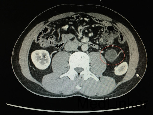 主诉:男性,56岁,左肾区绞痛1天。 现病史:1天前,无诱因出现左侧肾区疼痛,发作时可以忍受,无放射痛,无尿频尿急尿痛,无血尿,无排尿困难;今日凌晨6时,疼痛逐渐加重,无撕裂感,不伴大汗淋漓,无心悸胸闷,无咯血。 既往史、个人史、婚育史均无明显异常。