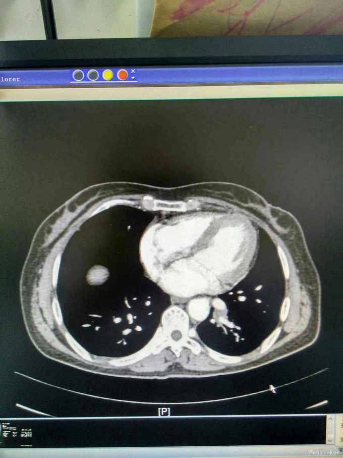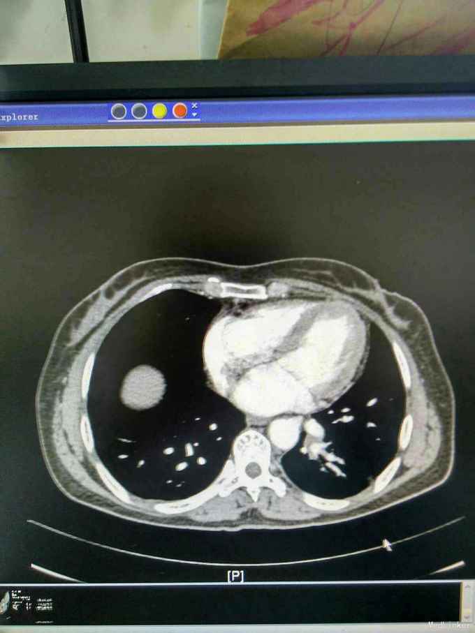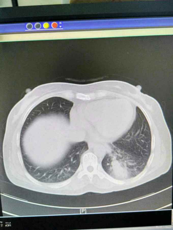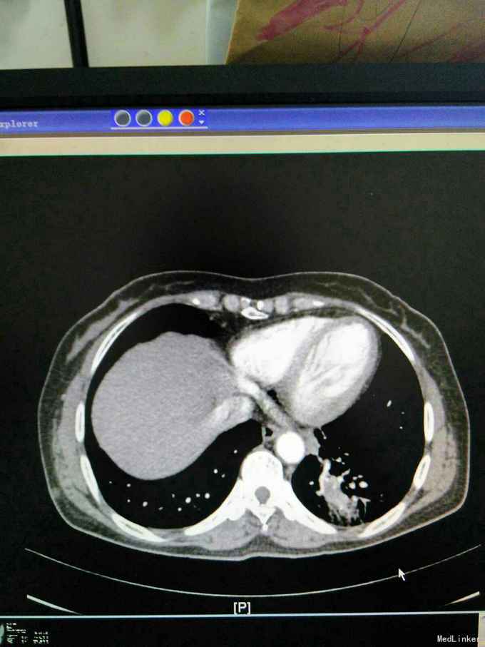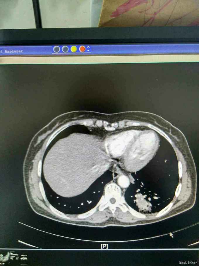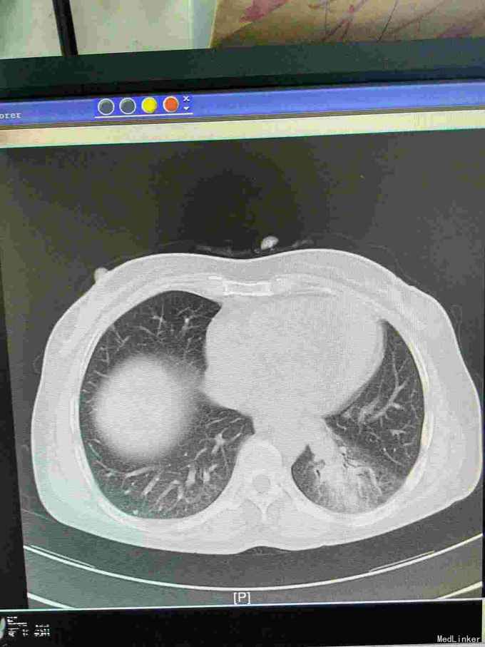患者44岁女性,以“咳嗽咳痰间断咯血1月余”为主诉入院,入院前1月余不明显诱因出现咳嗽,呈阵发性非刺激性,咳黄白痰,每日五六口,间断咯血,色鲜红,每次10到50毫升不等,余无特殊不适,就诊当地医院摄胸部ct提示左下肺炎,予抗感染止咳化痰止血处理后症状反复,半月前复查胸部CT提示肺部阴影较前增大。