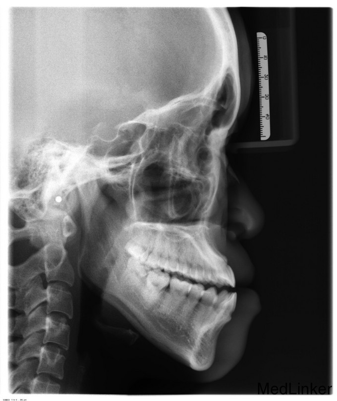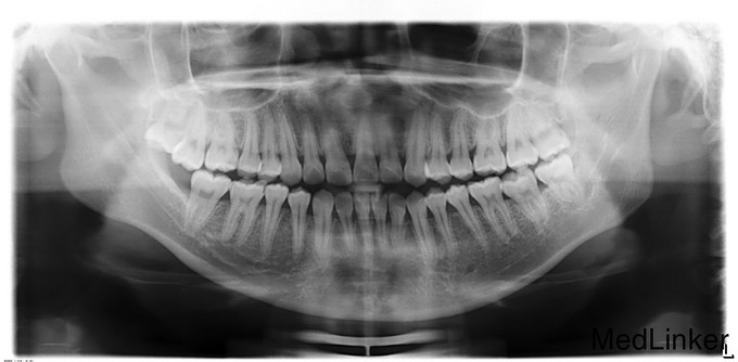双侧颜面部基本对称,下颌稍左偏,侧面观下颌稍突,双侧颞下颌关节区无弹响、压痛,双侧髁突活动度正常。开口度3.5cm,开口型“↘”。口内检查:全口恒牙列,口腔卫生一般,上下牙列中线不对齐,下牙列稍左偏,前牙对刃合。