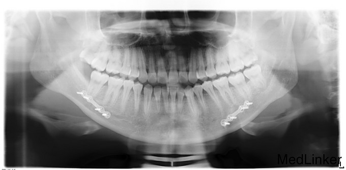 正颌术后半年余,患者2015年1月12日因“下颌偏斜10余年”来我院治疗,于2015年1月16日行“双侧下颌骨升支矢状劈开截骨前徙术+去骨皮质术+骨内坚固内固定术+上下颌牵引钉植入术”,今为取出下颌骨存留钛板来我院就诊,门诊以"正颌术后钛板存留"收入