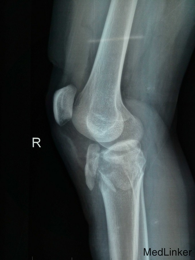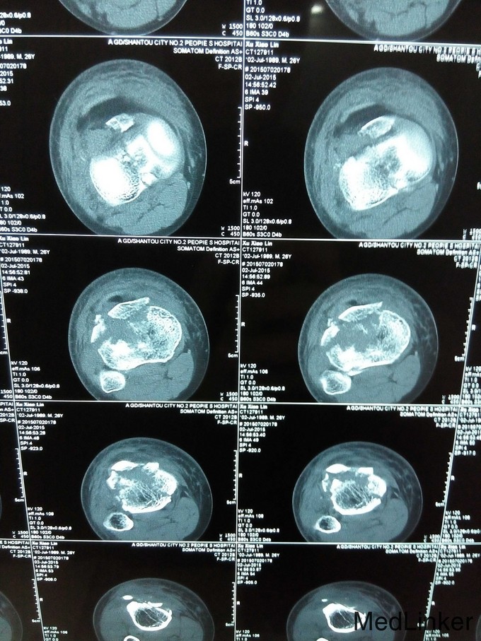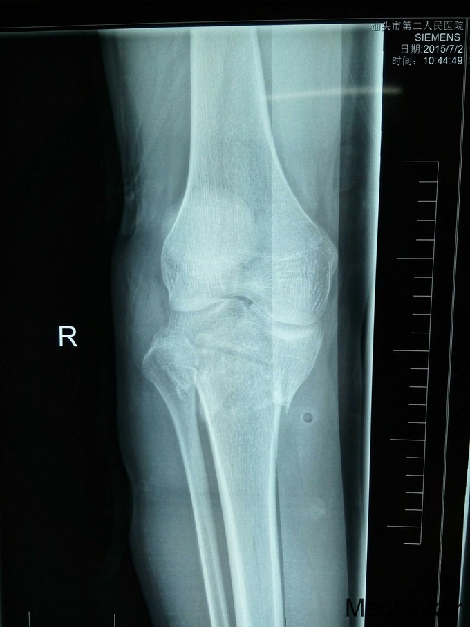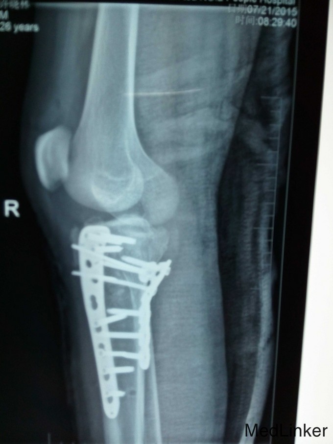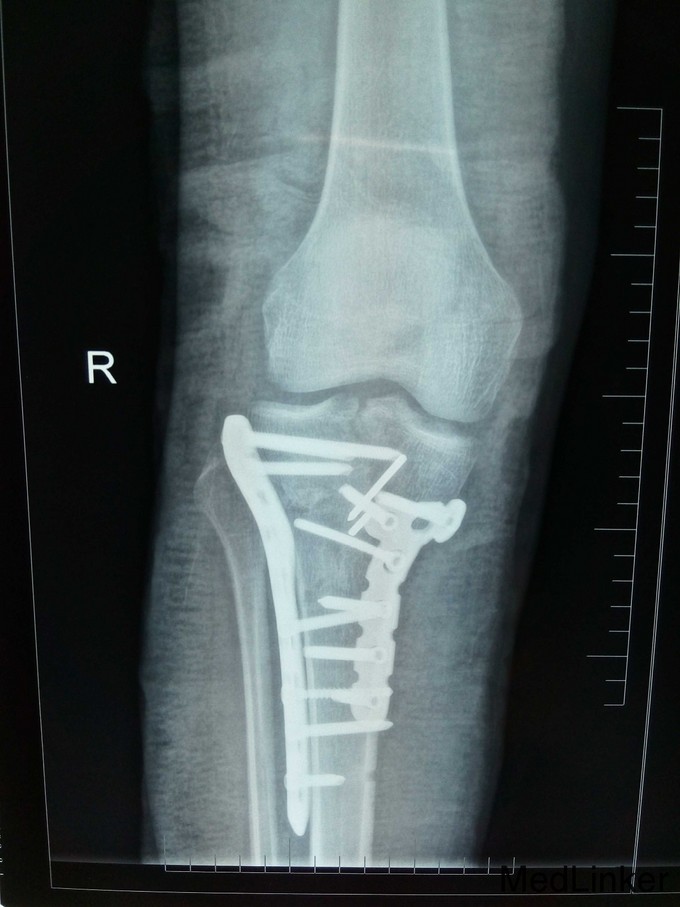 右胫骨平台粉碎性骨折(内外髁骨折) 入院后予跟骨骨牵引,一周后硬外麻下行胫骨平台骨折切开复位内固定术,术后伤口拆线痊愈出院。