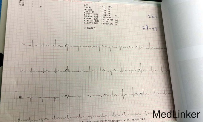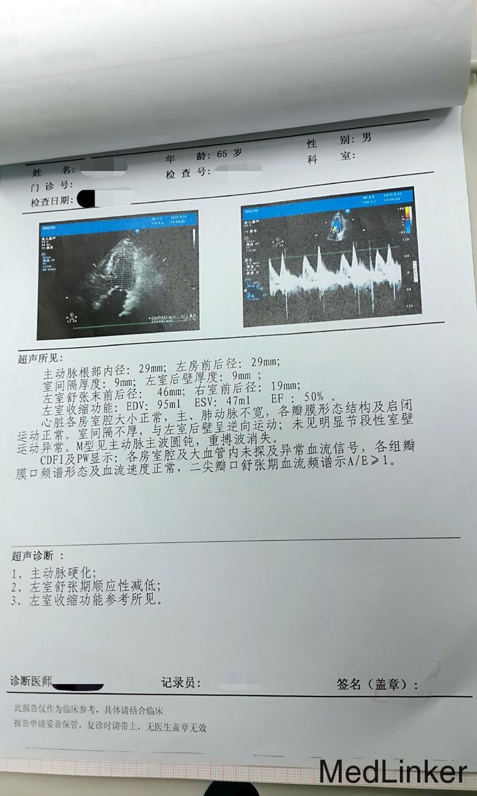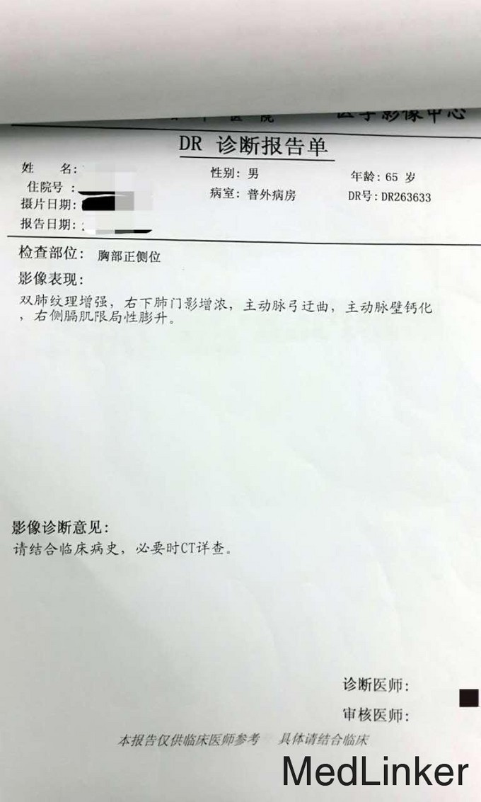 体温 36.8 脉搏 64次/分 呼吸 20次/分 血压 150/85 意识清,语音清晰,双瞳孔等大,开口正常,牙齿正常,颈软,扁桃体无肿大,气管居中,心音正常,心律整,双肺呼吸音粗,无干(湿)啰音,脊柱生理弯曲,穿刺区无感染,四肢活动自如。 辅助检查 心电图:正常心电图 心脏超声:1.主动脉硬化2.左室舒张期顺应性减低3.左室收缩功能:EF:50% 肝胆脾胰超声:肝囊肿,脂肪,胆囊结石伴炎性改变 肝功能无异常,肾功能无异常,电解质及酸碱平衡无异常 胸部CT:双肺纹理增强,右下肺门影增浓,主动脉弓迂曲,主动脉壁钙化,右侧膈肌限局性膨升。