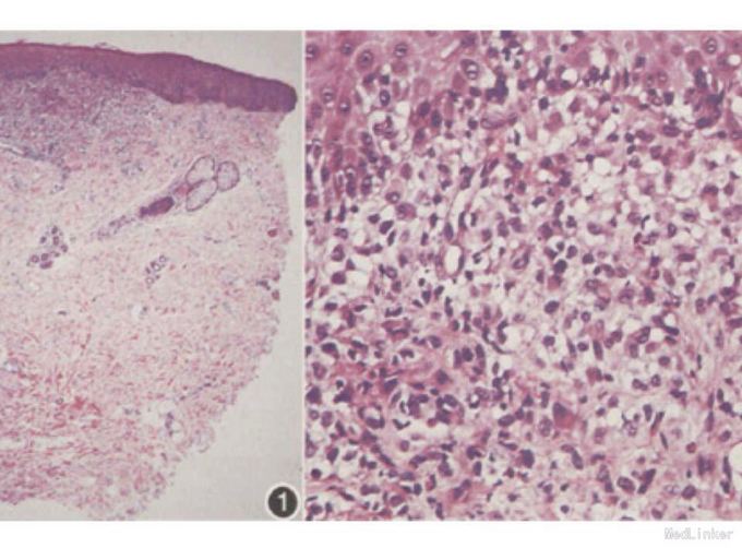查体:外阴可见数个米粒大小红丘疹,无压痛。 辅查:病理组织示局部真皮浅层片状增生的组织细胞,并向上侵犯表皮。部分核呈肾形。免疫组化Cd 1a,CD68,S-100均阳性。全身Ct未见转移灶。
