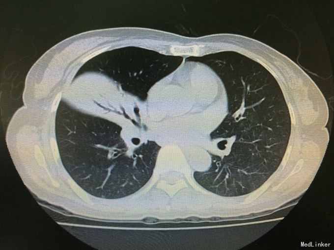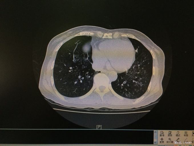 查体:双肺呼吸音粗,双肺底可闻及明显湿性啰音。 辅查:胸部CT示:双肺炎症。CRP66mg/l,ESR105mm/h,PCT0.074ng/ml。血常规、痰涂片及培养阴性。支气管镜示:左支气管见少量白色粘液状分泌物,右侧见中量白色脓性分泌物。支气管进管时患者无明显咽喉刺激反射。