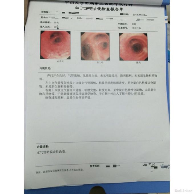 52岁女性,10余年前确诊鼻咽癌,并行放疗2次,5年前开始出现张口中度受限、言语轻度模糊不清、饮食饮水轻度呛咳。 主诉:反复咳嗽、咳痰15天。 现病史:15天前出现咳嗽咳痰,痰为白色稀水样,易咳出,外院查胸片示双肺感染,以右肺中叶明显,遂入院。