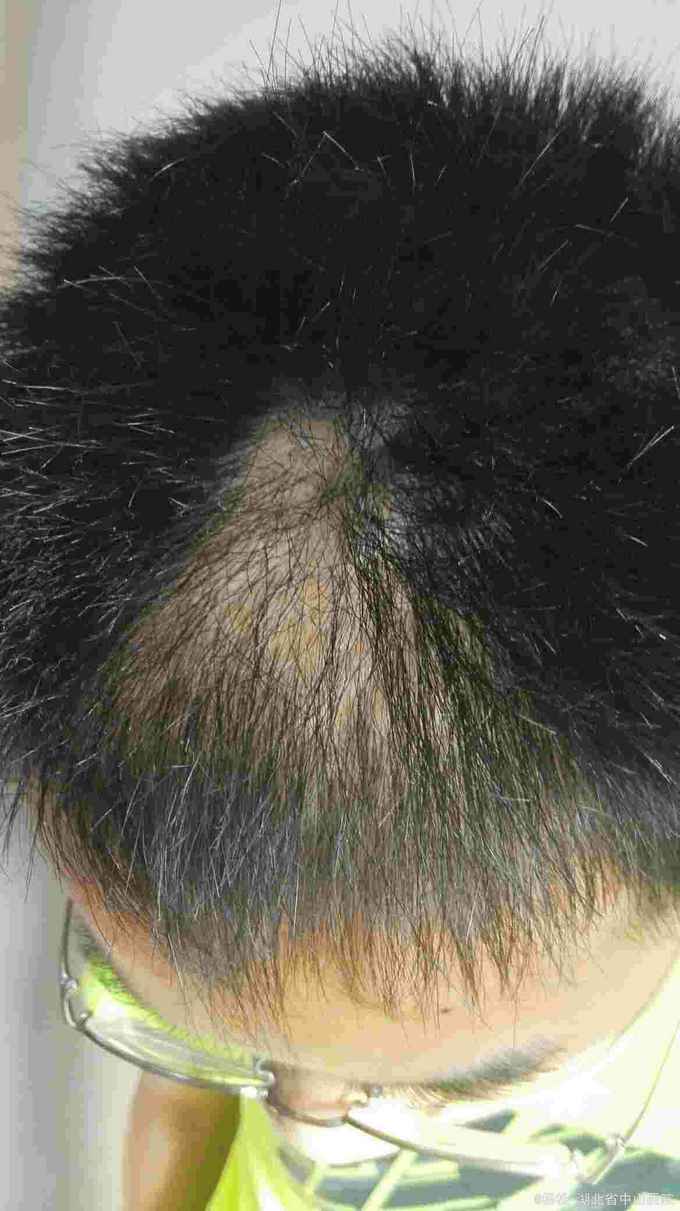 诊断为局限性脱发伴头发纵裂症。治疗给予蔓迪外用,养血生发胶囊口服。