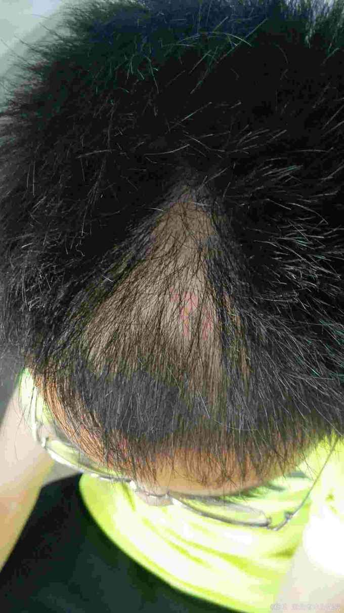 患儿左侧头皮近前额处可见一直径约5厘米左右大小的扇形头发稀疏区域,该区域头皮正常,头发比其他区域头发要短且顶端分叉。辅检,血常规,肝肾功能,自身抗体全套,补体及抗体全套,微量元素正常。
