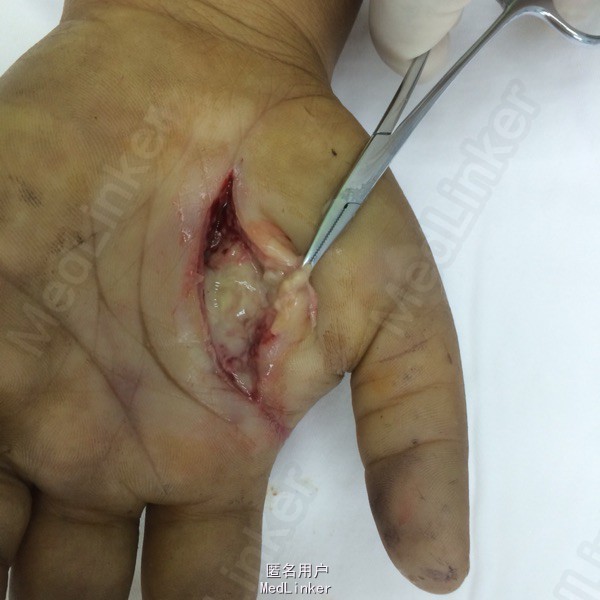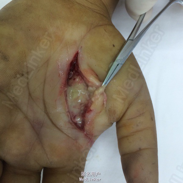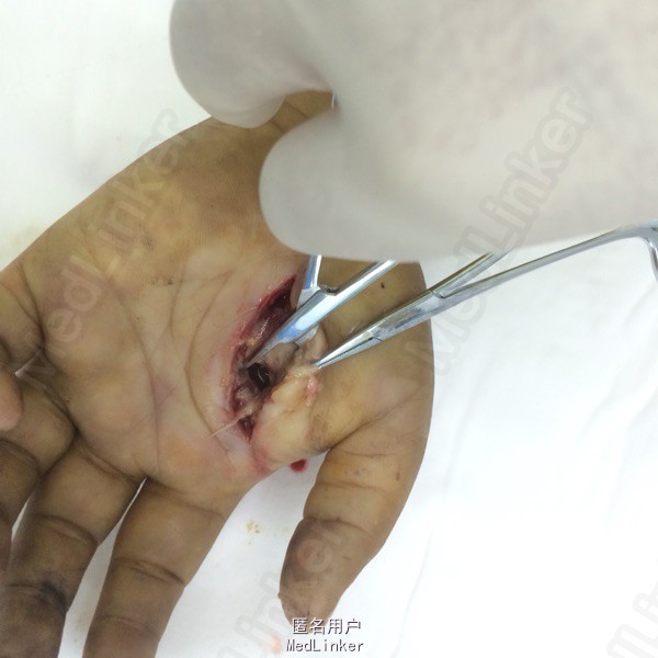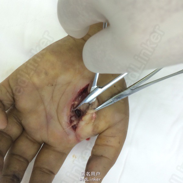 患者入院时已有高热症状,左手掌局部疼痛明显,明显红肿,压之波动感明显,为避免引起败血症故急诊切开引流+异物取出,术后效果可,经加强换药及纱布引流,患者临床恢复可后出院。
