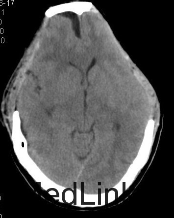 诊断:1、双侧额挫裂伤; 2、大脑镰、右侧额颞硬膜下出血;3、右额颞脑出血; 4、左枕骨骨折; 5、中枢神经系统感染 主要经过:入院后完善术前相关检查,行右侧额颞脑挫裂伤清除+去骨瓣减压+颅内压探头置入术;后行左侧额叶血肿清除+额颞顶去骨瓣减压术,术后予以抗感染、营养神经、改善循环、化痰、护胃、抗癫痫及营养支持治疗。 术后复查CT:双侧额颞顶骨局部缺如;左侧枕骨不连。 双侧额颞顶部皮下软组织稍肿胀。双侧额叶软化灶;右侧额颞部硬膜下及大脑纵裂池积液;右侧额颞部少量积气