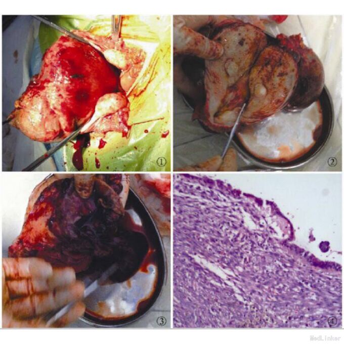 入院诊断:左侧附件区囊性肿物破裂(巧克力样囊肿待排)。予以行腰硬联合麻醉下经腹全子宫切除术加双侧输卵管切除术。术中见大网膜粘连包裹于膀胱底部,腹腔内见咖啡色陈旧性血性液体约20 mL。子宫体增大,直径约12cm,形态欠规则,表面可见多个肌瘤结节突起,大者直径约3cm,多个紫蓝色囊肿突起于浆膜面,直径从1~7cm不等,囊肿最大者位于左侧宫角处浆膜下。子宫前壁与膀胱粘连。双侧输卵管色鲜红,表面布满乳白色炎性颗粒(否认结核病史)。双侧卵巢均略增大,色苍白,表面未见明显内异病灶,可见多个增大卵泡。探查及分离粘连过程中,有咖啡色血性液自囊腔内流出,抽吸出囊内咖啡色血性液约30mL。探毕,行上术式。纵向切开宫体达子宫腔,宫腔被挤压偏于子宫后壁,内膜厚约0.2cm,未见明显浸润性病灶。子宫肌层弥漫性增厚,以前壁明显。质硬韧,肌壁厚2.0~5.0cm,肌壁粗糙,内见散在微小囊腔,有巧克力样液流出,拭后,前壁见肌瘤结节3枚,结节直径1.0~1.5 cm。剖面见漩涡状结构。剖开左侧宫角部紫蓝色囊性肿物,少量巧克力样液流出,并见大块凝血样物,粘稠如胶冻。术后诊断:子宫浆膜下子宫内膜异位囊肿破裂?病理诊断:(子宫宫角部)子宫内膜异位并囊肿形成。