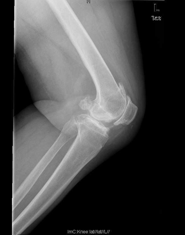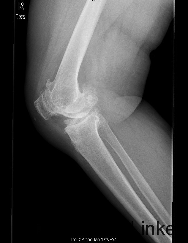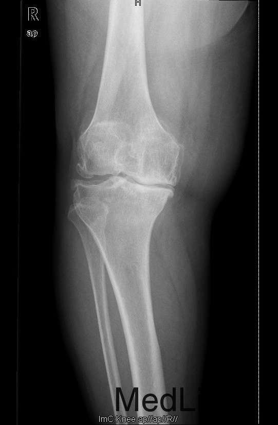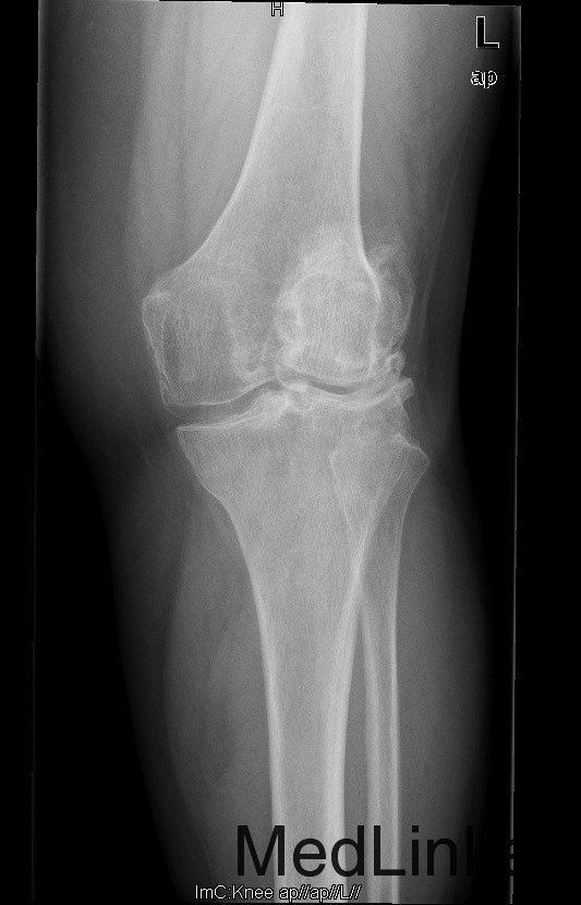 查体:步态跛行,双膝屈曲畸形,左膝外翻、右膝内翻畸形,双膝内外侧关节间隙及髌股关节间隙压痛明显,右侧重,右膝内翻:5°,右膝屈70°,伸-10°;左膝:屈曲:100°,伸:-5°,外翻:20°,双膝主被动屈伸活动时疼痛,双膝髌下摩擦音(+)。 辅助检查:右膝关节间隙狭窄,软骨下骨硬化,髌股关节间隙消失,左膝关节间隙狭窄,软骨下骨硬化,髌股关节间隙狭窄,双膝髌骨、股骨、胫骨周围大量骨赘形成,关节腔内均可见游离体。