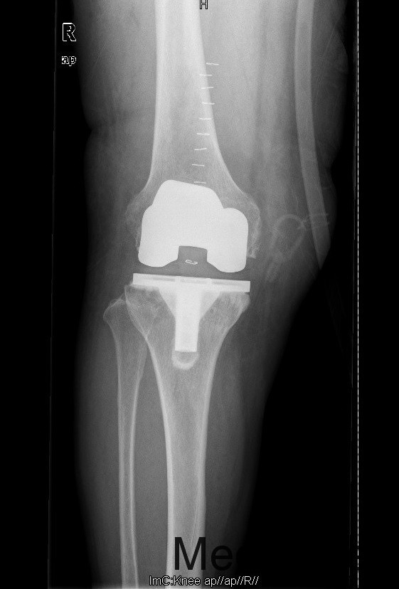 诊断:1.双膝重度骨关节炎继发右膝屈曲内翻畸形,左膝屈曲外翻畸形(Krackow Ⅰ型)2.高血压病(3级 极高危) 治疗:积极行术前准备,待血压等稳定后于全麻下行右侧全膝关节置换术,术后常规治疗,并鼓励其锻炼。