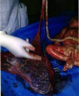 入院后孕妇宫缩渐不规律,10月9日8时查无宫缩,给予0.5%缩宫素静脉滴注。 17:20 查宫缩规律,持续20~30秒,间歇期3—5分钟,宫颈扩张2 cm,先露头浮,胎位LOA,胎心135/min。 18:00 宫缩持续30—50秒,间歇期2~3分钟,宫颈扩张3 cm,先露-2,胎心140/min,胎位LOA。 18:25 胎心100/min,立即给予左侧卧位吸氧,查宫颈扩张5 cm,先露0,阴道流出血性羊水,未行窥视,血性羊水原因不明, 18:40 胎心60/rain,考虑脐带因素致胎儿缺氧,胎心变慢。 19:00 胎心消失,孕妇无异常腹痛。B超检查示头颅光环完整,颅内结构对称,颈部未见明显压迹,胎心搏动及胎动消失,胎盘位于子宫前壁,附着良好。 19:35 宫口开全。 19:50 胎儿娩出,同时伴大量血液涌出,量约500 ml。 30分钟后胎盘仍不剥离,行手取胎盘。查胎盘、胎膜:胎盘约22 cm X 17 cm,厚2—3 crll,完整,脐带长约50cm,附着于距胎盘边缘约5 cm的胎膜上,于胎膜破口处血管分4支,直径1~2 mm,其中2支断裂,见图1。 诊断:孕40+5周;死产;脐带帆状附着;前置血管断裂