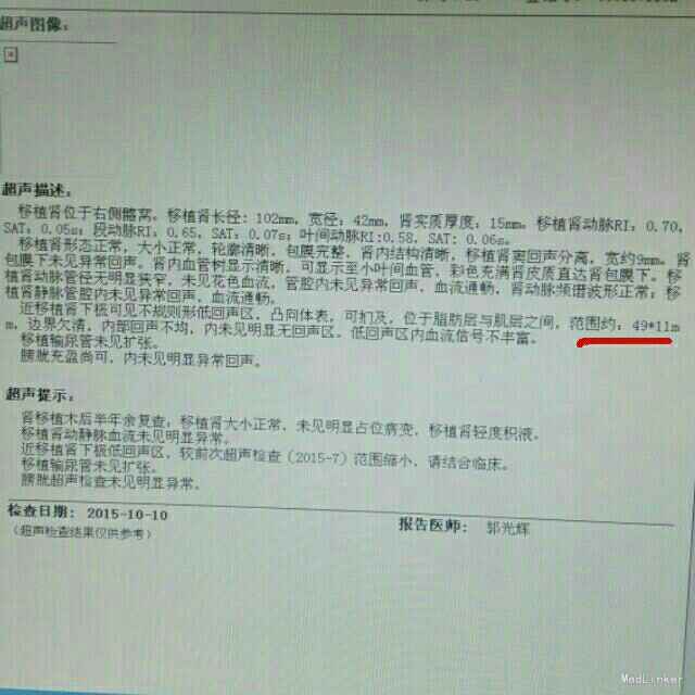 主诉:肾移植术后半年,移植肾区疼痛不适1月 病史:患者男,53岁,因尿毒症于2015年4月在我院行异体肾移植术,手术过程顺利,术后恢复良好,移植肾功能良好,肌酐维持在约120umol/L,服用FK506+MMF+Pred免疫抑制维持治疗。1月前开始出现移植肾区疼痛不适,体表有局限性隆起,并发低热,体温约37.5℃。为行进一步治疗来我院就诊。