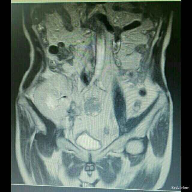 入院后行移植肾区磁共振检查,提示移植肾区多发性淋巴结肿大;彩超提示移植肾下极可见不规则低回声区,凸向体表,位于脂肪层与肌层之间,范围约49*11mm