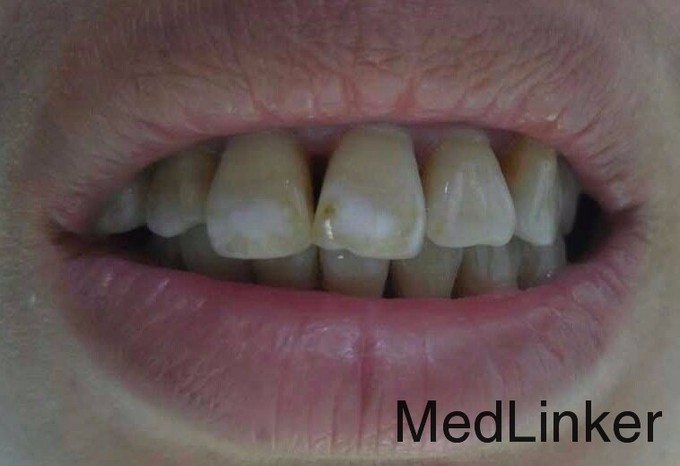 牙齿表面有白色及黄褐色斑块,影响美观