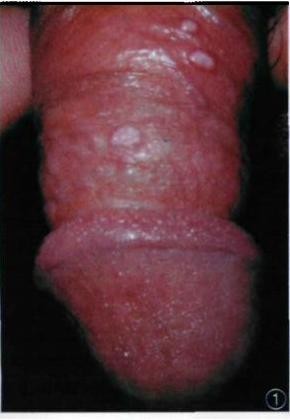 患者,男, 23岁, 因阴茎丘疹1年余 于2005年10月来我科就诊。 患者 1 年前发现阴茎起 3 粒小丘疹 , 微痒, 无痛感,未诊治。 丘疹缓慢增大。 曾用 “ 皮炎平” 等外涂, 无明显疗效 。有婚外性生活史, 未婚 ,性伴无类似皮损。