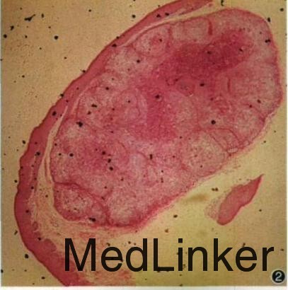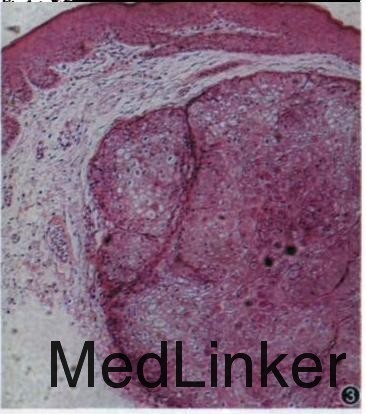 体检 : 各系统检查无异常。皮肤科情况: 阴茎背侧见 3 粒绿豆大丘疹 , 边界清楚, 苍白色 , 呈半球状隆起, 高出皮面 , 表面针帽大细颗粒 样统状增生, 粗糙 , 略有光泽 , 顶端无凹陷 ,质地中等, 无触痛 ( 图 1 ) 。 醋酸白试验阴性, RPR 阴性 ,HIV抗体阴性。初步诊断 : 尖锐湿疣? 治疗 : CO2激光烧灼 。 烧灼过程中, 皮损内可挤压出白色乳酪样物, 停止激光治疗, 进行阴茎皮损组织病理检查。结果示 : 表皮高度增生 , 深入真皮内, 形成一 假包膜 , 包膜内见多个梨状小叶 , 可见软疣小体 (图 2)