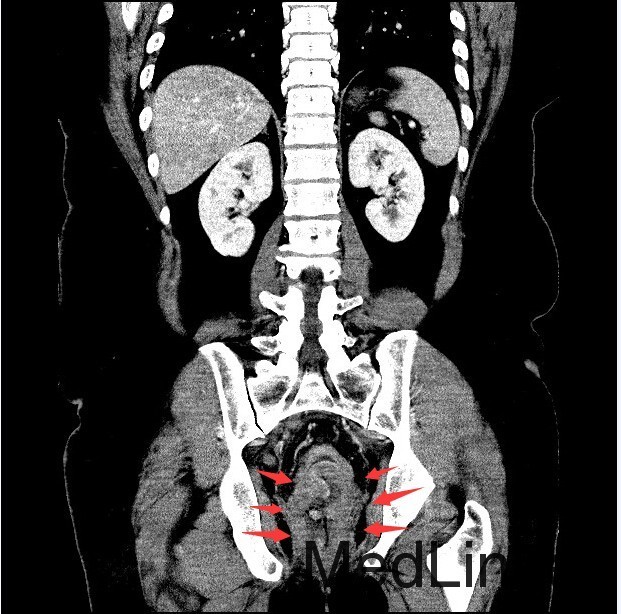 讨论:胃肠道是原发性结外淋巴瘤最常见的累及部位。其中胃是最常见的发病部位,其次是小肠,而结肠和直肠少见。本例属于直肠淋巴瘤,属于少见肿瘤,影像表现与直肠癌相似,因此临床常常误诊为直肠癌,本例即误诊为直肠癌。影像学上只要认真观察一般能通过以下几点将两者鉴别开:淋巴瘤一般累及的肠段较长,肠壁较厚,肠腔变窄不明显,呈动脉瘤样扩张,没有肠梗阻表现,周围脂肪界面清晰。而大肠癌则相对较局限,常伴有肠腔的狭窄及肠梗阻的表现,而且常通过浆膜直接向周围浸润,周围脂肪间隙模糊。只要认真寻找这些影像征象,还是能够将两者较好的区别开来。