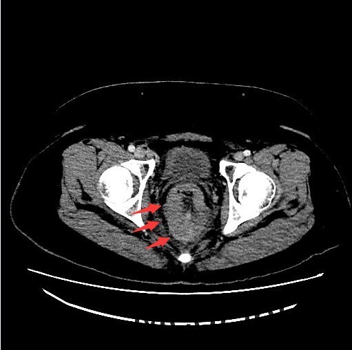 主诉:大便习惯改变1月余,加重伴腹痛10余天 病史:中年男性,慢性起病。患者1月余前无明显诱因出现大便习惯改变,大便变细,次数增多,约3次/天,伴大便带血,为淡红色血水,量较少,有里急后重感,无黏液,至当地医院就诊,诊断为“结肠炎”,予消炎治疗(具体用药不详)后症状无缓解,未予进一步诊治,后出现肛门停止排便,持续约10余天。10余天前症状加重,出现便血,每天10余次,为淡红色血水,量较少,性质同前,伴中下腹刺痛。现为进一步诊治,门诊拟“直肠恶性肿瘤”收入我科。近1月来体重下降20kg。