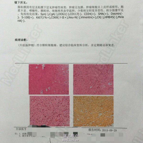 入院诊断:盲肠肿瘤 入院后行盲肠肿物ESD术,后因出血难以止血改行腹腔镜下肿物切除术,术后病理提示:颗粒细胞瘤。