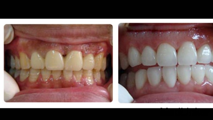 女,40岁,上前牙颜色发黄,要求漂白,冷光美白。无过敏病史。