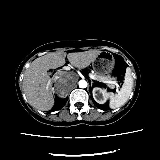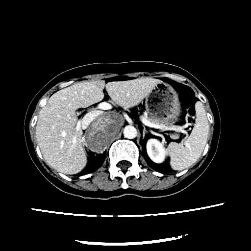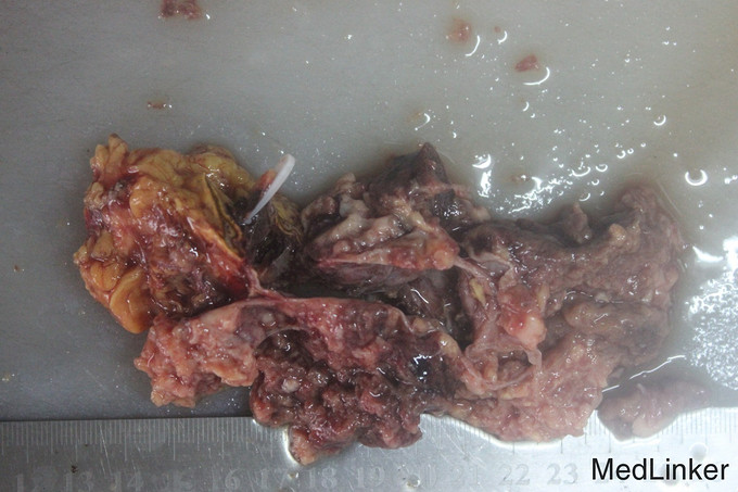 随访:病理回报示:嗜铬细胞瘤。 讨论:该例嗜铬细胞瘤具有较典型的影像表现,我们能看到右侧肾上腺椭圆形肿块,边界清楚,直径较大,这可区别于肾上腺腺瘤,后者一般小于2cm。增强扫描肿块明显强化,并可见无强化低密度区,可能是肿瘤常坏死或陈旧性出血引起。而且该患者有嗜铬细胞瘤引起的继发性高血压,不过追问病史没有典型的阵发性高血压发作。