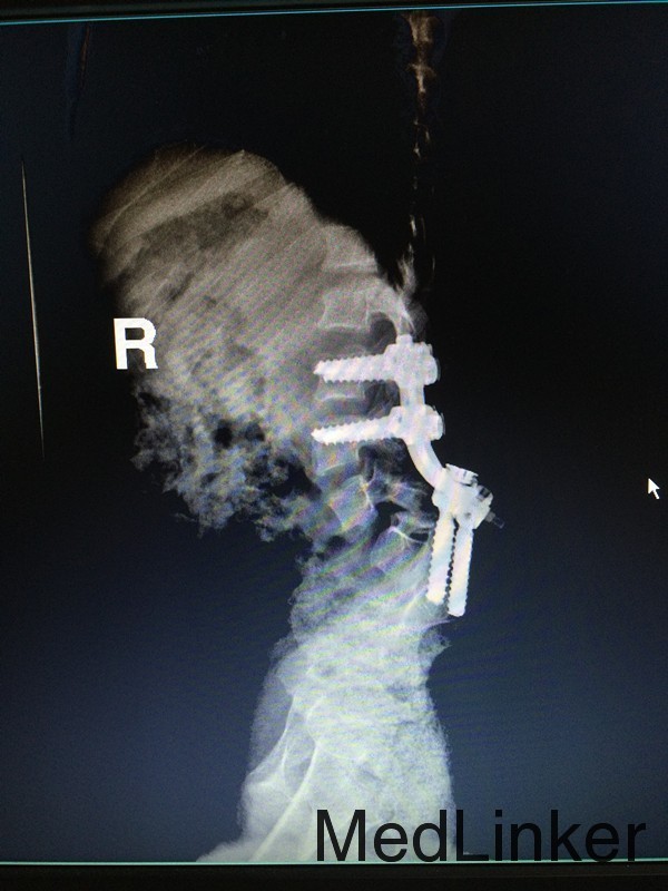 查体:腰椎后突畸形,双小腿肌肉萎缩,双足内翻畸形,双侧踇指伸指无力。 辅助检查:行脊椎MR检查提示:骶椎发育畸形,脊髓圆锥低位,考虑脊髓栓系综合症,神经源性膀胱。
