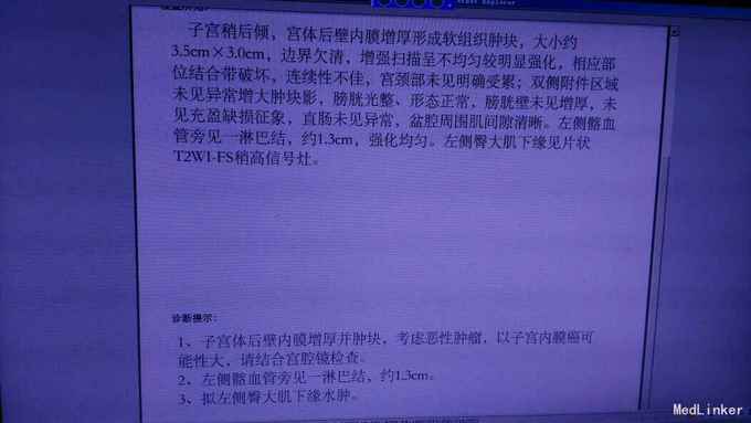 妇科检查宫颈光滑,子宫稍大,内诊未及异常。 术前MR检查示淋巴转移。详见附图