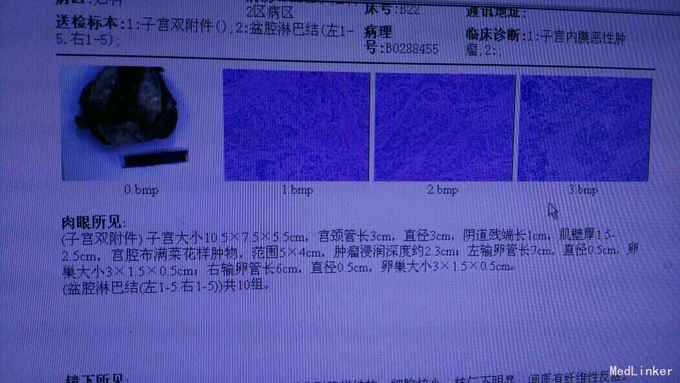 诊断子宫内膜癌。 行腹腔镜全子宫双附件切除加盆腔淋巴清扫术。术后病理示淋巴转移。术后补充了放化疗。