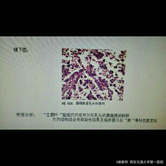 完善相关检查后,向患者及家属说明病情。患者坚持要求首要治疗头部占位性病变。全麻下行左侧额叶病变切除,术中冰冻提示中分化乳头状腺癌,肺转移性可能性大。患者及家属要求出院,已向建议进一步明确诊断,找到原发灶,积极治疗。