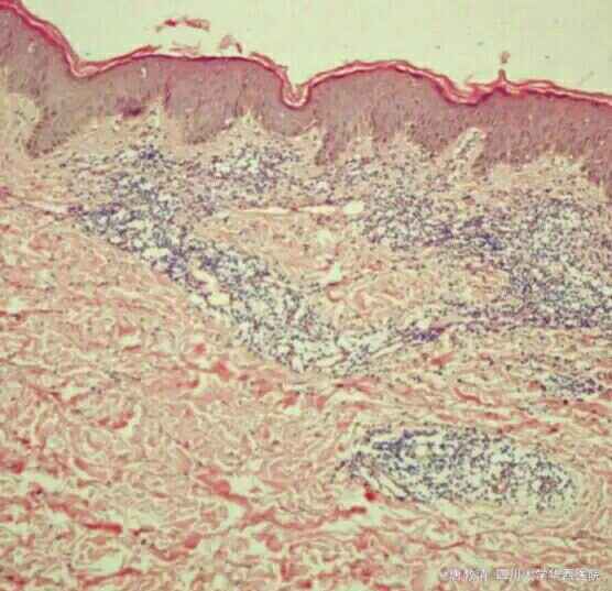 皮肤科检查:躯干四肢可见暗红色或紫红色水肿性红斑,中间颜色较淡,边界尚清,压之呈不完全褪色。 皮损组织病理:角化过度,表皮轻度增生,局部基底层液化变性,真皮浅层轻度水肿,血管周围淋巴细胞及少量嗜中性粒细胞浸润,呈慢性非特异性皮炎改变。