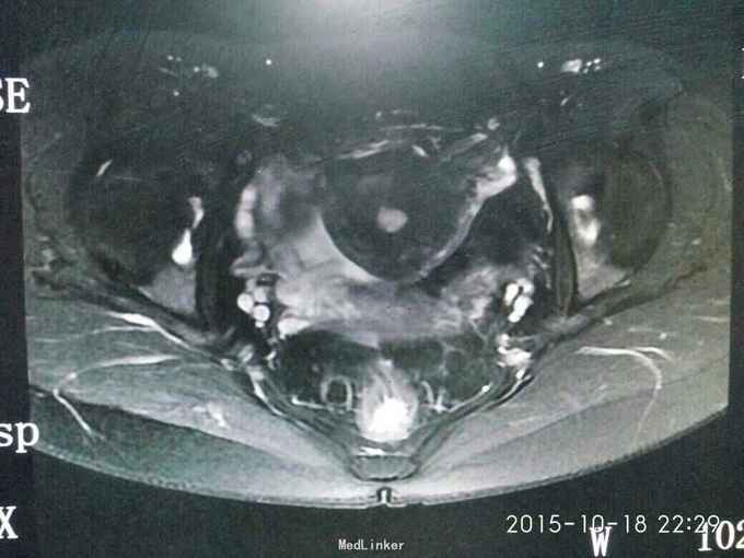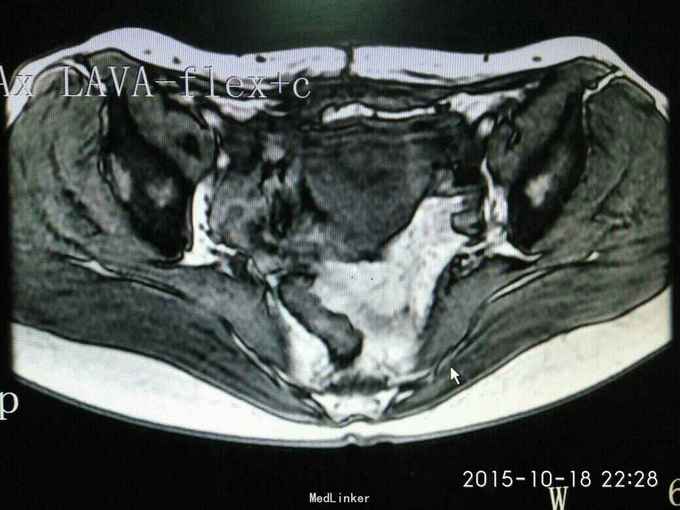 查体:妇检:外阴已婚已产式;阴道:畅,软,见少量淡黄色分泌物;宫颈少糜;子宫前位,鸭蛋大,无压痛;双侧附件未及异常。 辅助检查:我院病理会诊示:(子宫)低级别子宫内膜肉瘤。盆腔MRI示:子宫前壁近峡部肌层内异常信号。