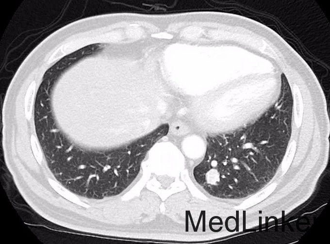 患者男,62岁,主因“右腰区疼痛半月余,入院检查发现双肺多发性占位性病变”收入院。 患者半月余前无明显诱因下出现右腰区疼痛,行腹部CT检查示:左侧肾上腺形态改变;左肾区条形软组织影,不除外萎缩或发育不良的左肾;于胸部CT结果示:左肺各叶、右肺上叶、中叶多发结节影