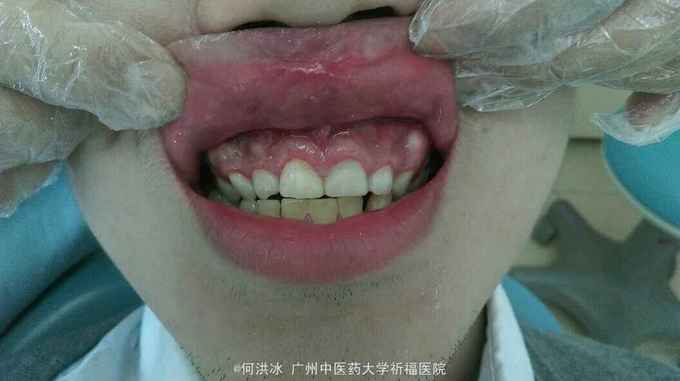 检查:手部及其他部位检查,以于相关科室处理,略。 颌面部检查,右侧颧部,鼻尖,上唇,多出有擦伤。张口度可。 口腔检查,前牙区牙槽粘膜擦伤,较浅,牙龈形态未破裂,充血、红肿较明显。12-22牙冠切端折裂,轻度松动,11,21髓露,冷诊稍敏感。 X片查,牙根未发现折裂影。 牙槽骨无松动,咬合关系错乱,对刃牙合。